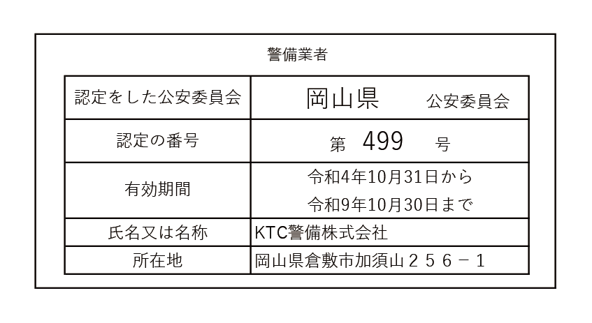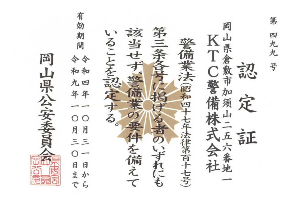 | 認定(許可) | 令和4年10月 岡山県公安委員会 第499号 |